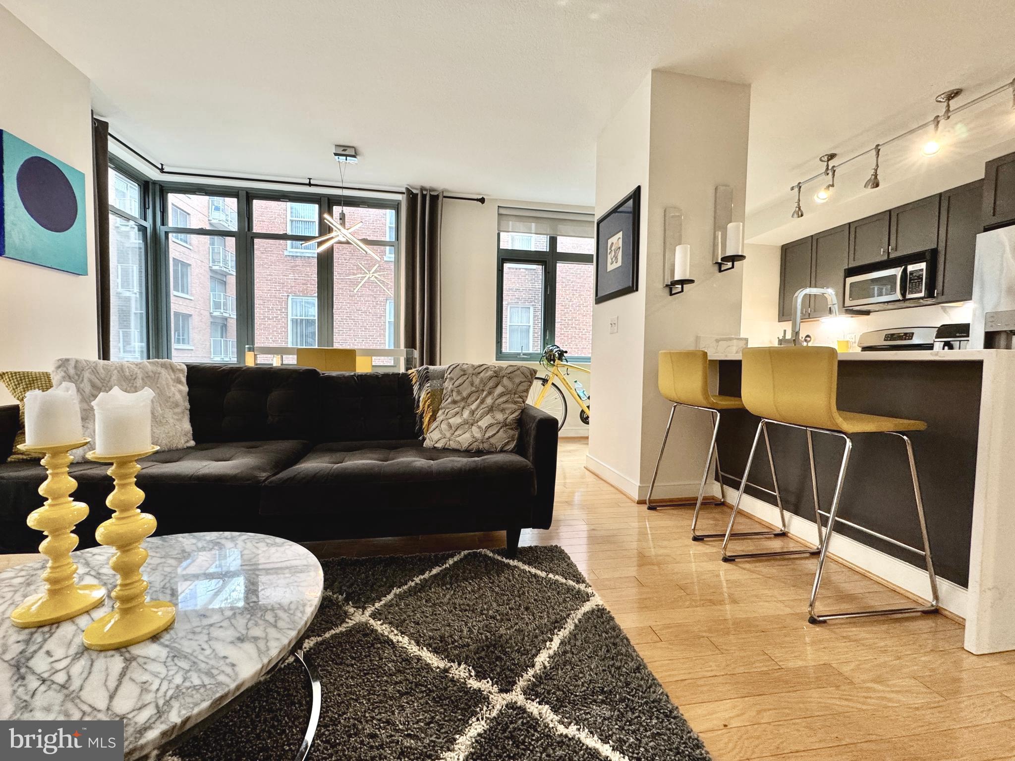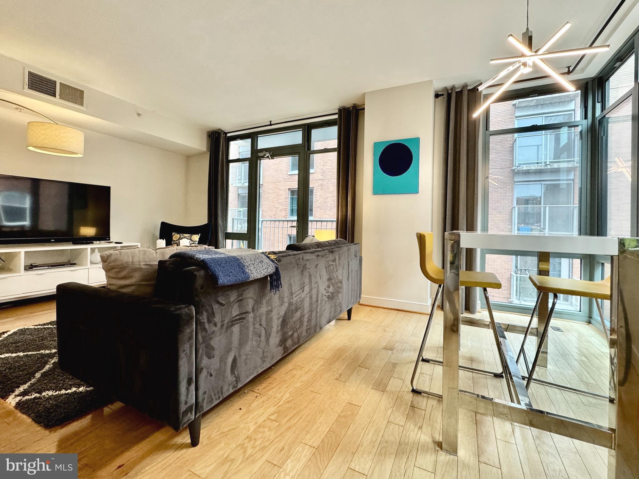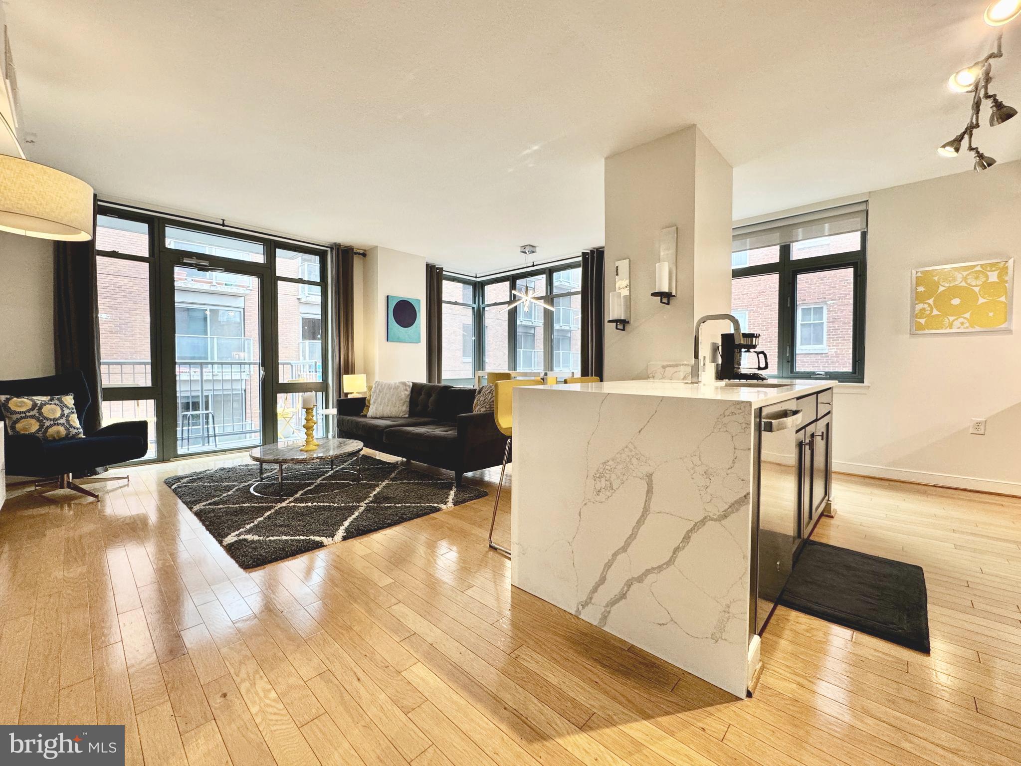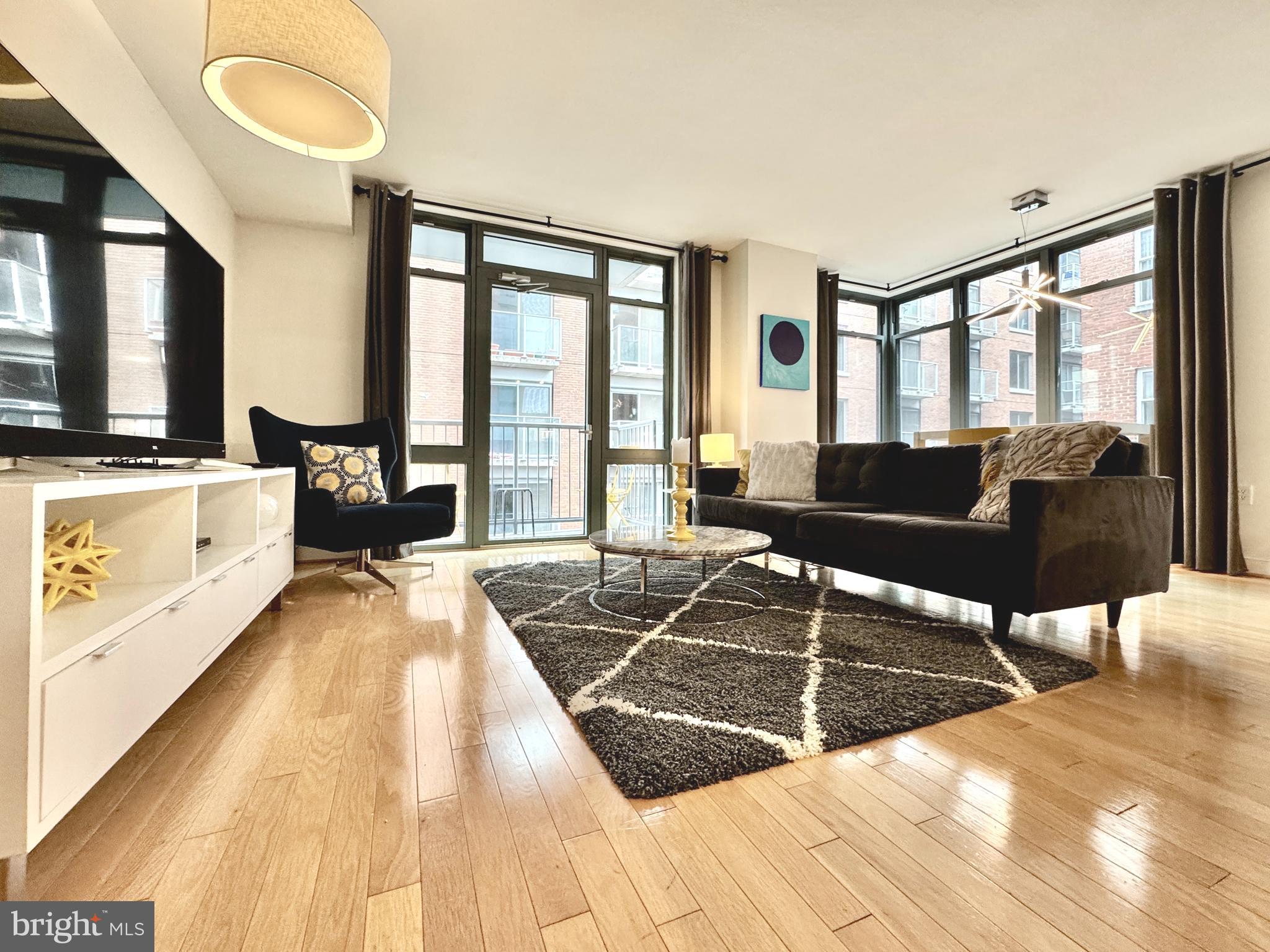 FREE USE OF A BIKE INCLUDED IN THE LEASE! Open and light 983 square foot two-bed/one-bath luxury condo with parking in perfect Shaw location. Available furnished or unfurnished + free use of a bike! *** The Unit: Floor-to-ceiling windows, corner unit, open kitchen, quartz counters & waterfall bar, stainless appliances, washer/dryer, dishwasher, wood floors, updated lighting, large primary walk-in closet with Elfa shelving, private balcony and a secure garage parking spot. *** The Building: Full-time concierge, keyless entry, well-appointed gym, expansive roof deck with gas grills, quiet one-way street, three-minute walk to Blagden Alley, 6 mins to the Convention Center Metro,12 mins to Logan Circle. *** The Deal: $3,850/month; available immediately. Pets considered on a case-by-case basis, with additional deposit and monthly fee.