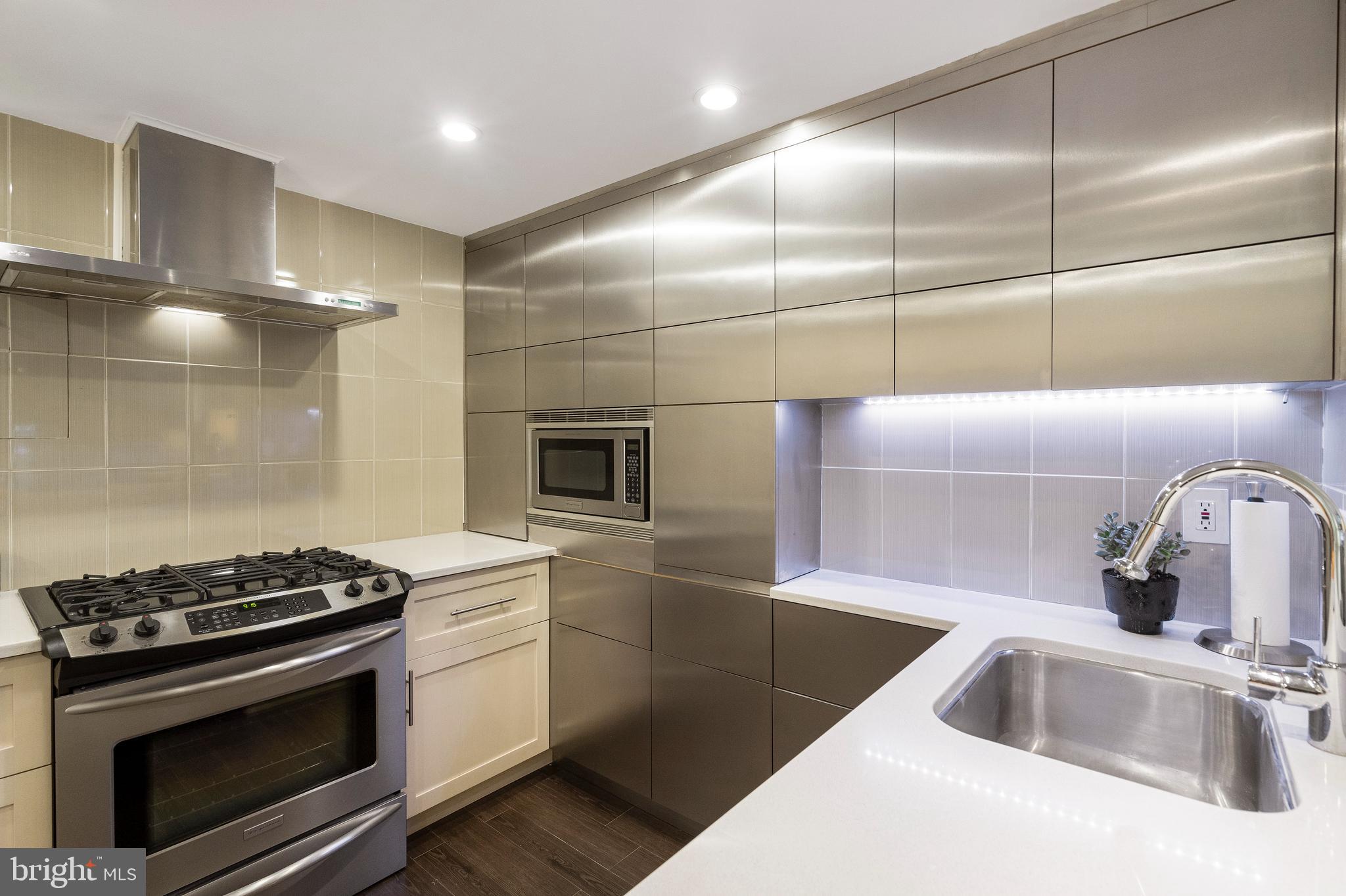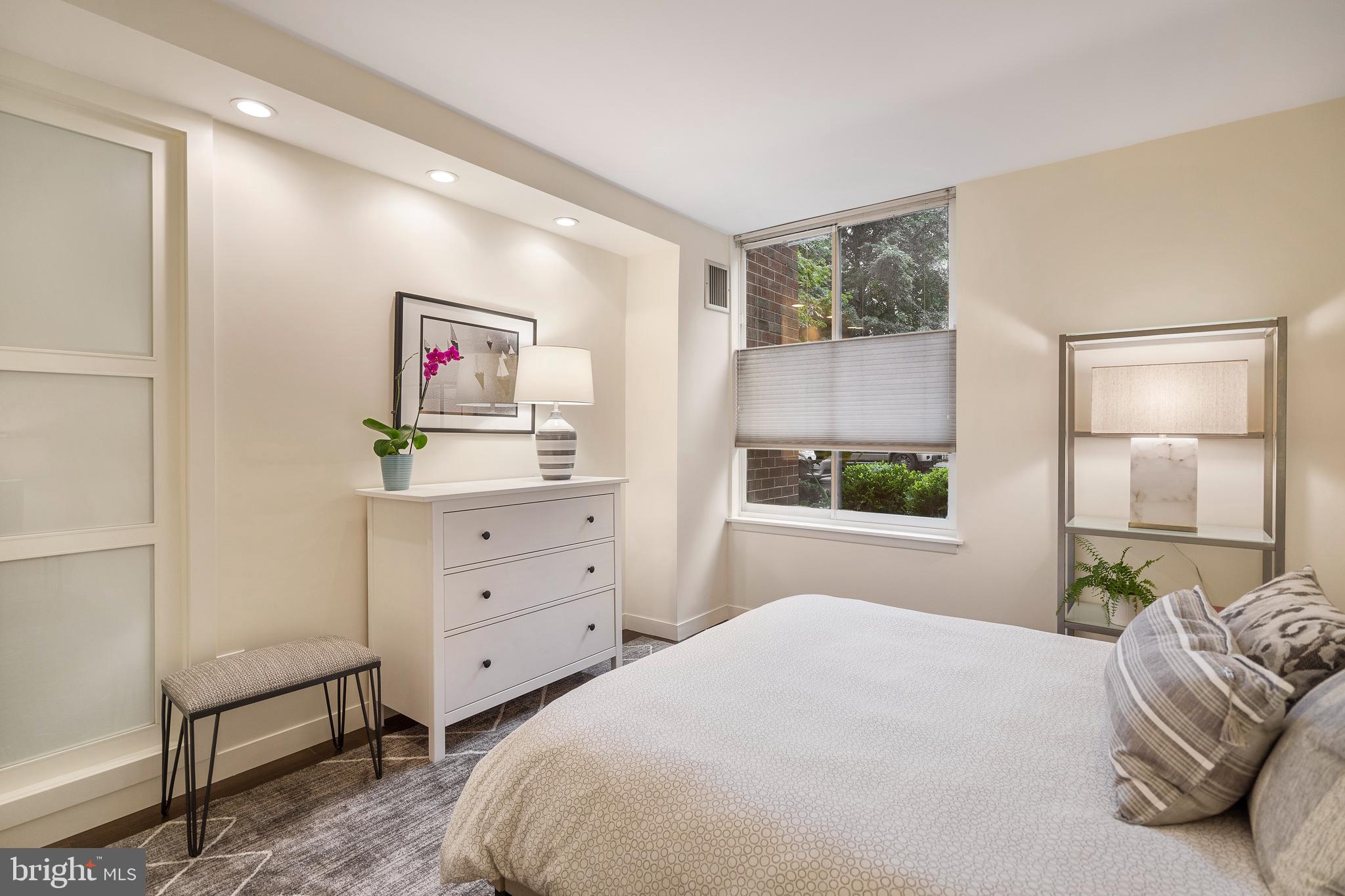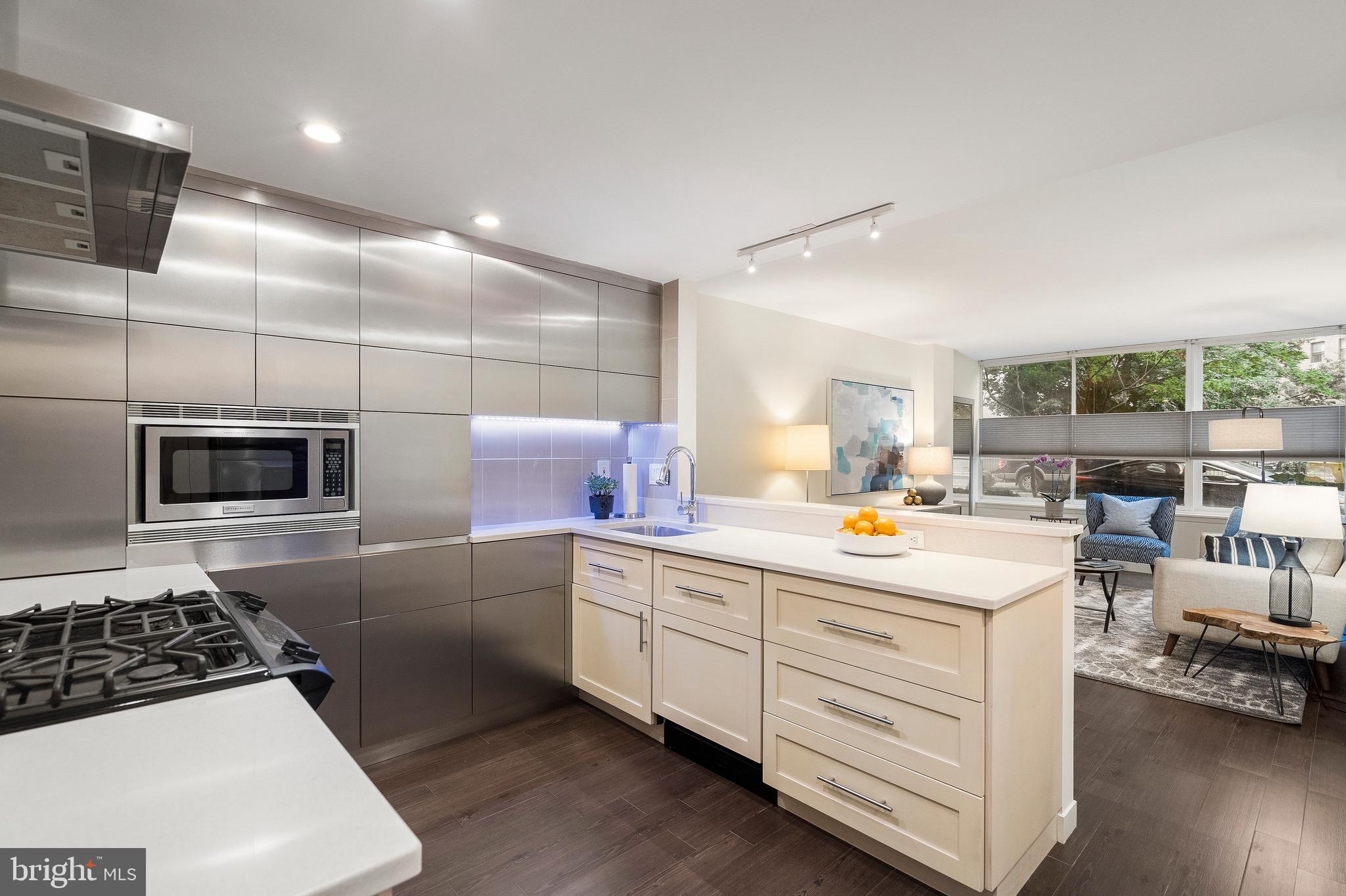 ***Available March 1st.*** Why compromise when you can have it all?! Garage parking? Check. Rooftop pool? Check. In-unit washer/dryer? 24-hour concierge? All utilities included? Check, check and check! This residence has been meticulously updated with the most sophisticated finishes and space-maximizing design. The kitchen features custom cabinets, including a sleek stainless steel cabinetry wall, built-in microwave, a tiled feature wall and a pantry wall with tons of flexible storage. Recessed lights, pocket and frosted glass doors and frosted glass corner accents allow light to shine through the unit, creating a sense that this home punches well above its class in terms of size. You'll love the sleek Porcelanosa wood-look porcelain plank floors that stretch throughout the unit (and are heated!). And you'll feel like you're at the spa everyday in this gorgeous bath, with floor-to-ceiling Porcelanosa tiles, ample storage and large shower with dual shower heads and built-in bench. Relax at the rooftop pool, have some friends over and grill out. You won't want to miss this one! One cat permitted with additional $25 monthly fee. One block to Red Line Metro Station.
