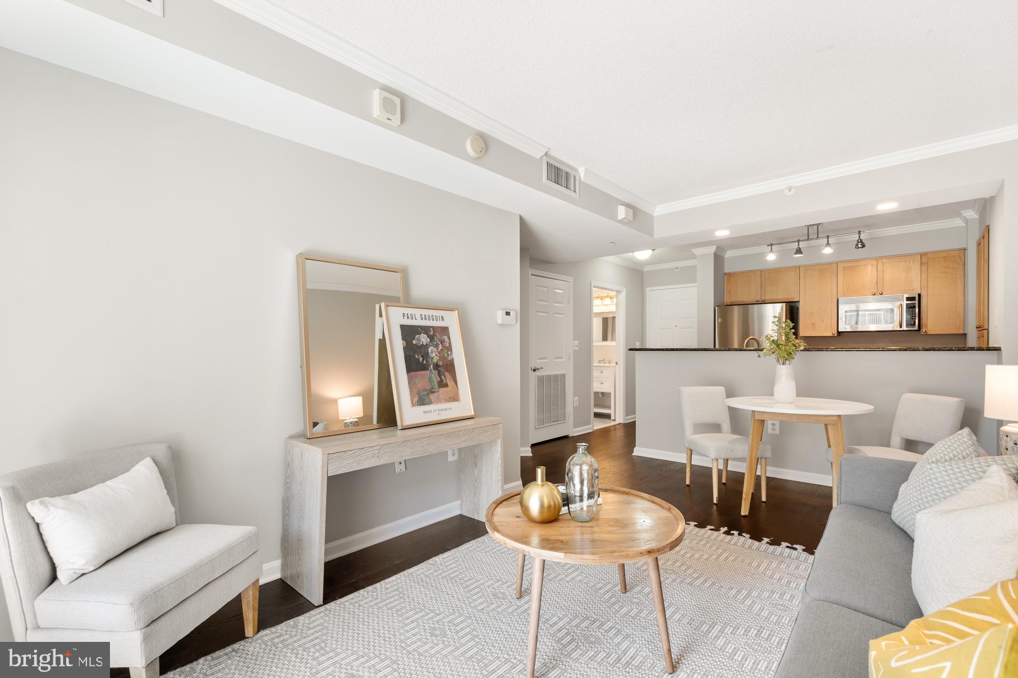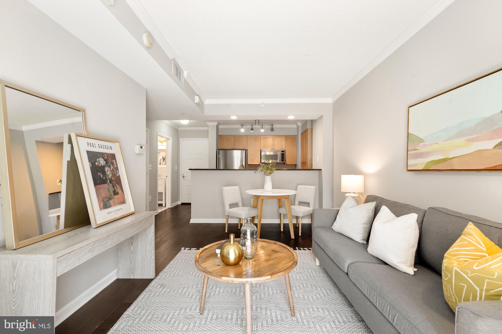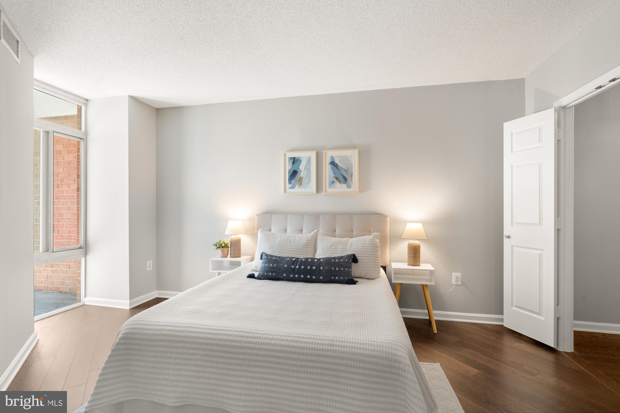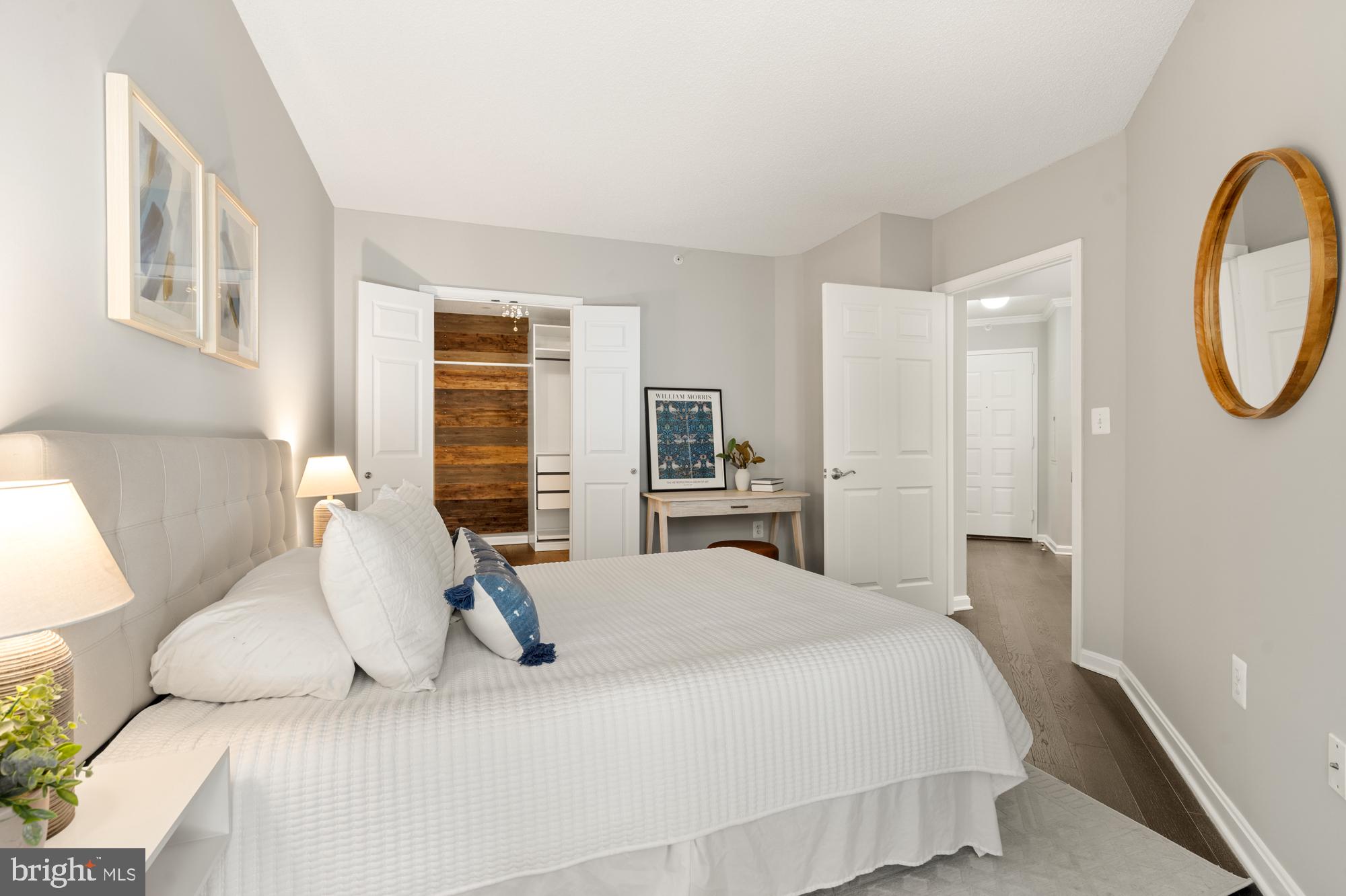 Come see this beautifully upgraded condo with an open floor plan in the upscale Northampton Place! Freshly painted and updated with hardwood floors throughout. The fully-equipped kitchen comes with stainless steel appliances and granite countertops. A seamless flow from the open living room leads to a balcony offering captivating views of DC and the Washington Monument. The primary bedroom features a custom large walk-in closet and an upgraded bathroom with new ceramic tile and in-unit washer/dryer. Residents enjoy a host of amenities, including 24-hour concierge service, outdoor pool, fitness center, internet and screening room, library with billiards and a party room. Located just a 15-minute drive from DC/the Pentagon and numerous other attractions, this condo offers a blend of luxury and accessibility. This residence also comes with one large assigned garage parking space and extra storage!