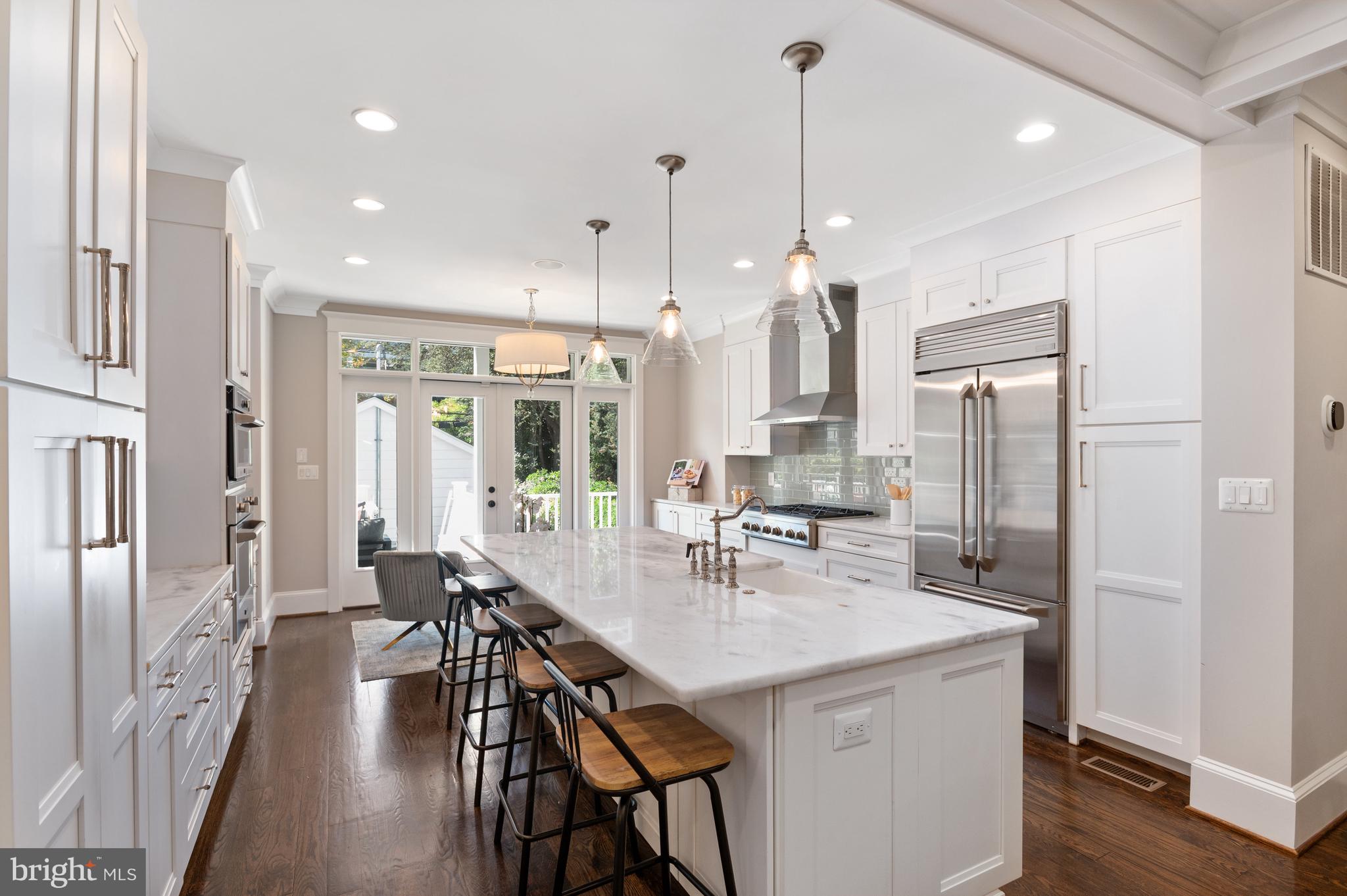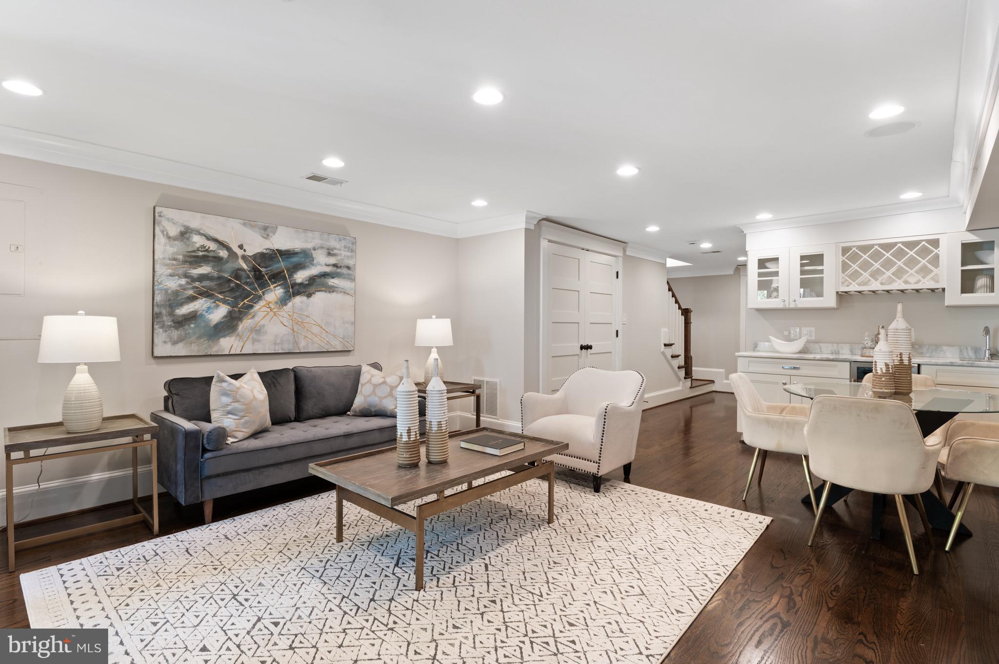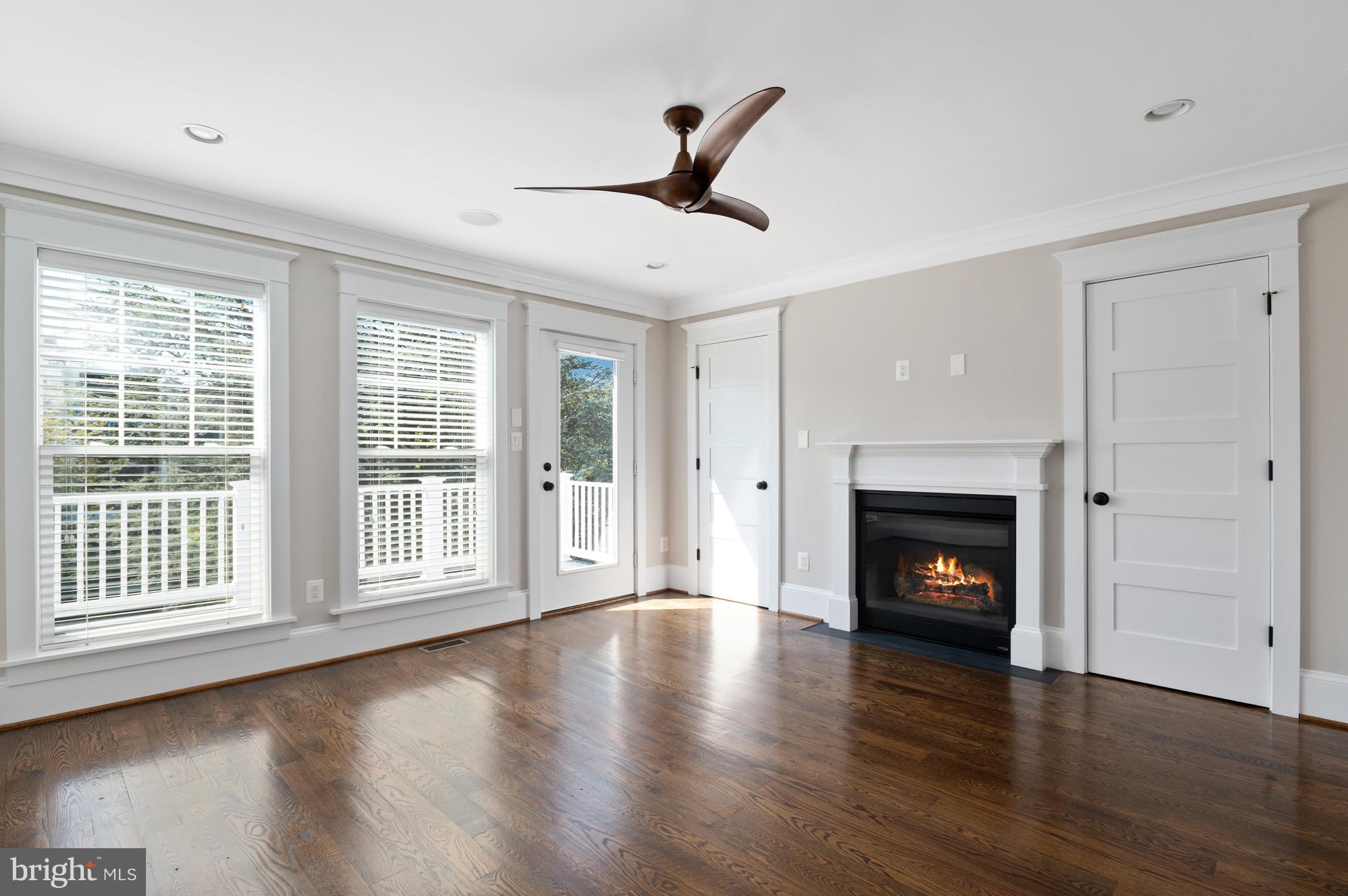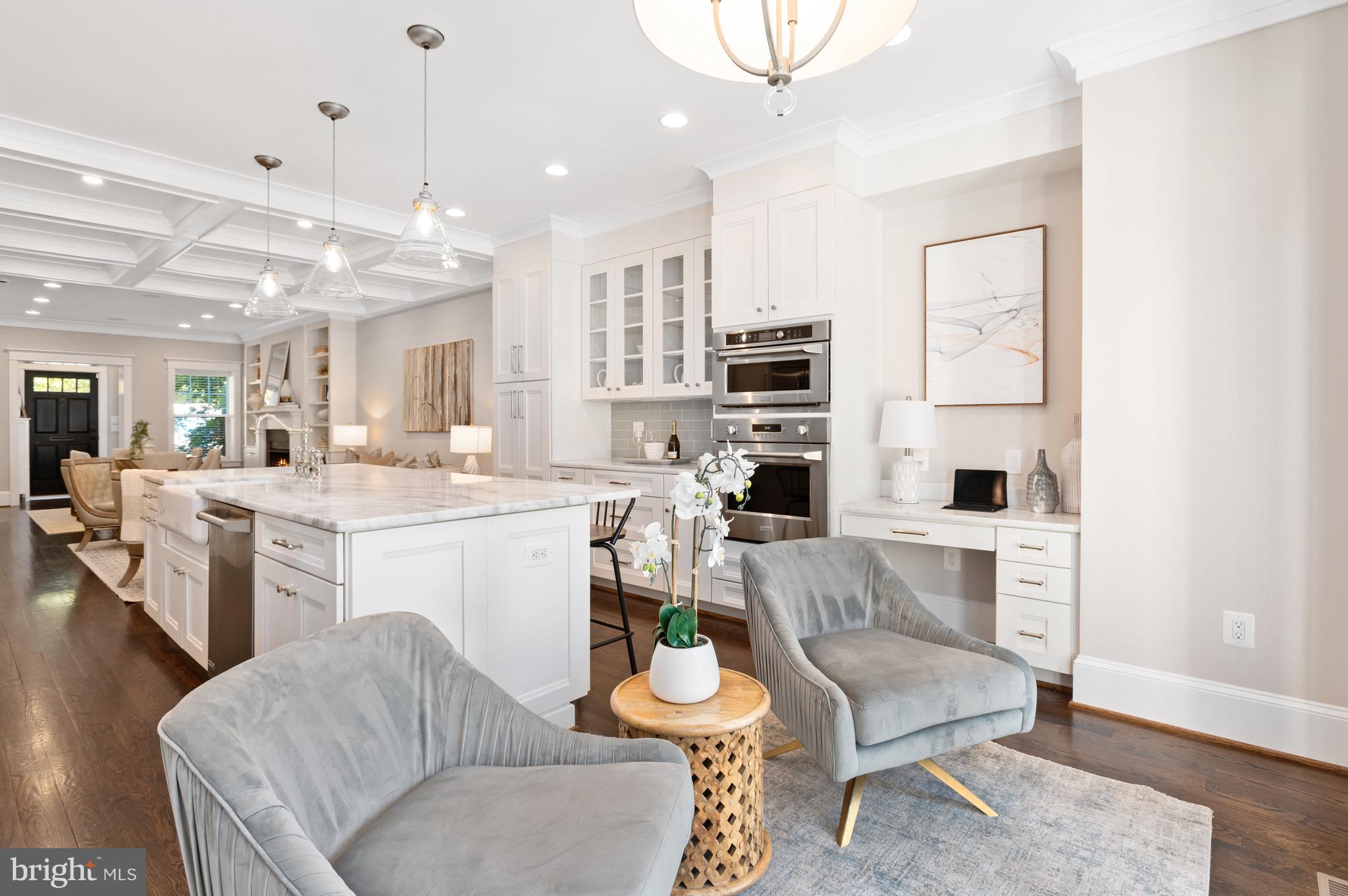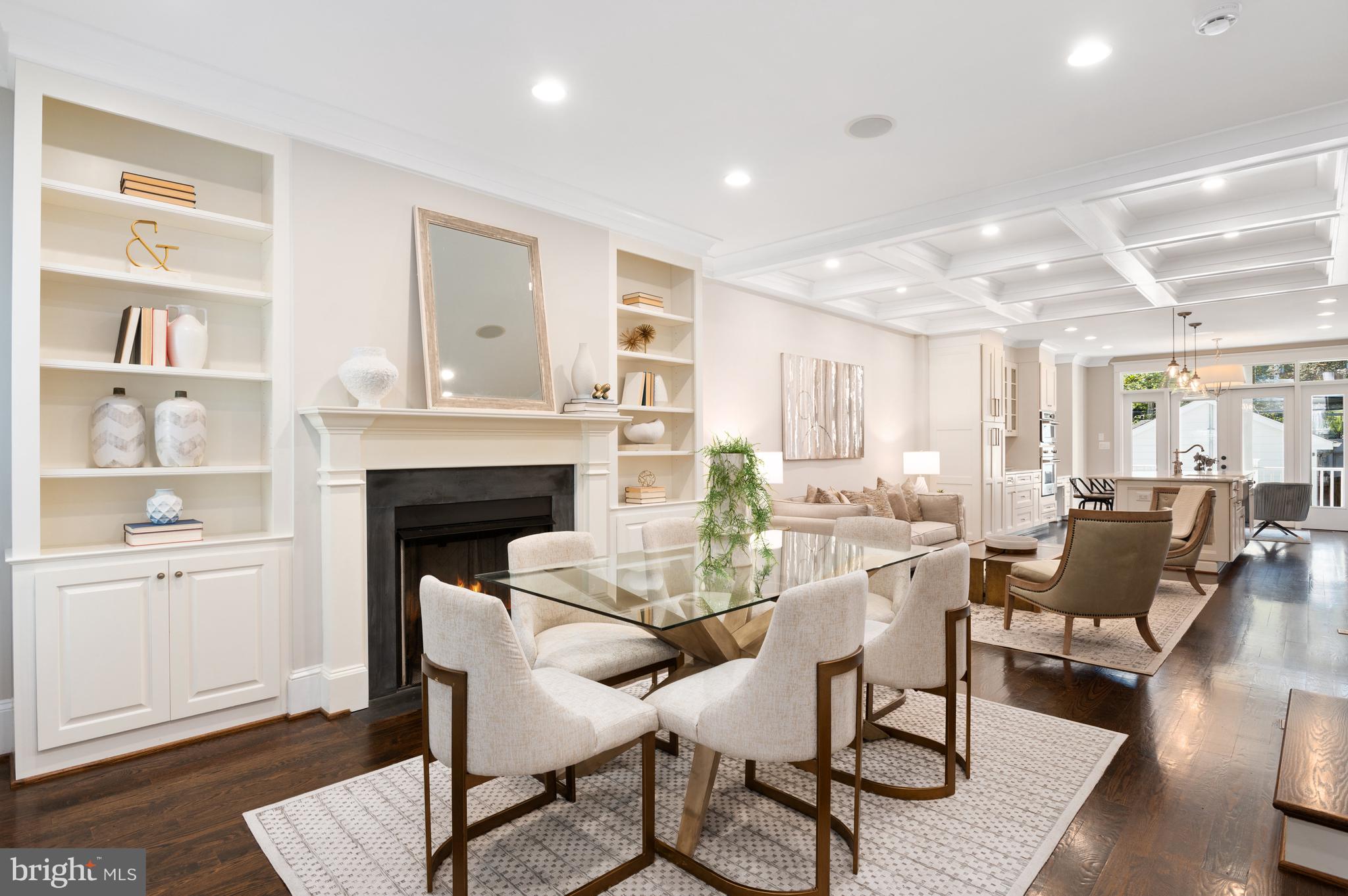 Welcome to this impeccably maintained, upscale Bluewater build, custom-designed for modern living, effortless entertaining, and everyday convenience in the heart of Burleith. The main level boasts an open-concept layout, connecting the kitchen, living, and dining areas. The dining area is centered around an impressive fireplace flanked by custom-built shelves, while the living room showcases elegant, coffered ceilings and recessed lighting. The chef's kitchen is equipped with well-designed cabinetry, high-end appliances, a spacious island, and opens directly to a deck that's perfect for summer grilling. A rear sitting area off the kitchen can be used as a flex space that overlooks the deck. A cubby area and powder room can also be found by the front door for added convenience. Brazilian hard-wood floors are found throughout the home.