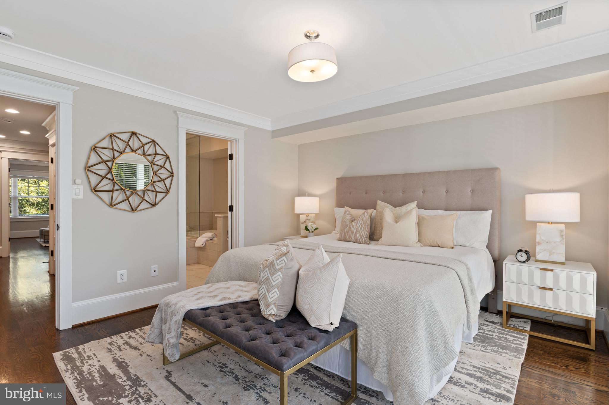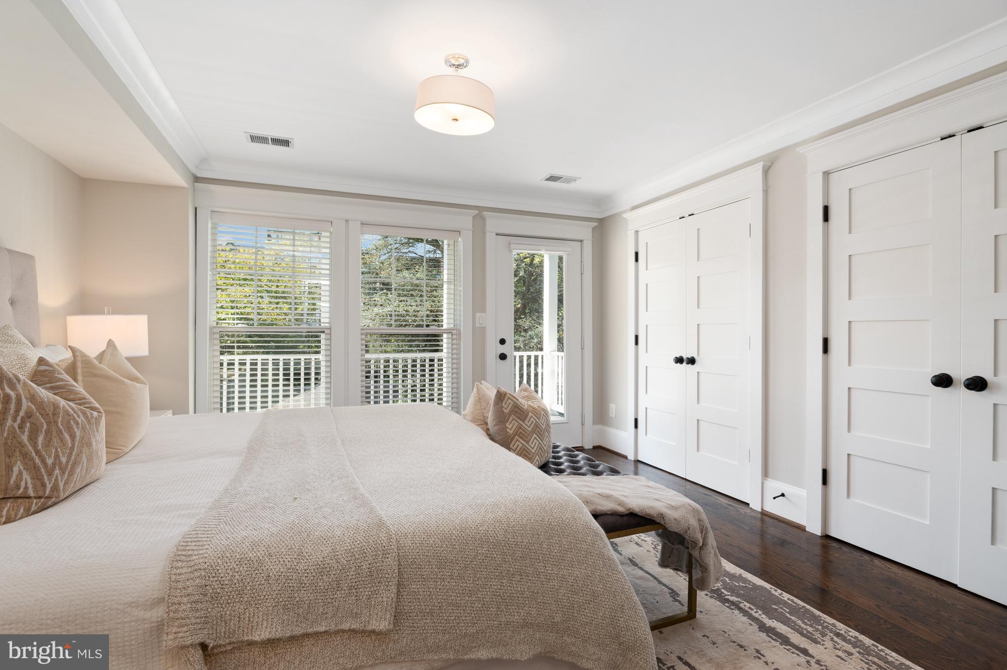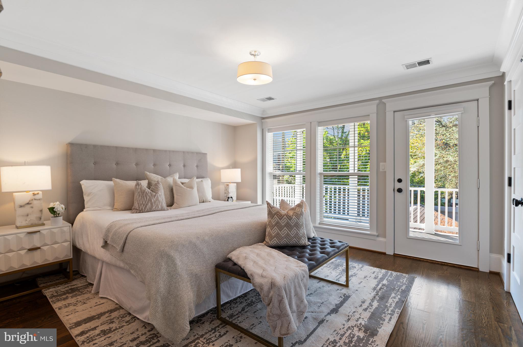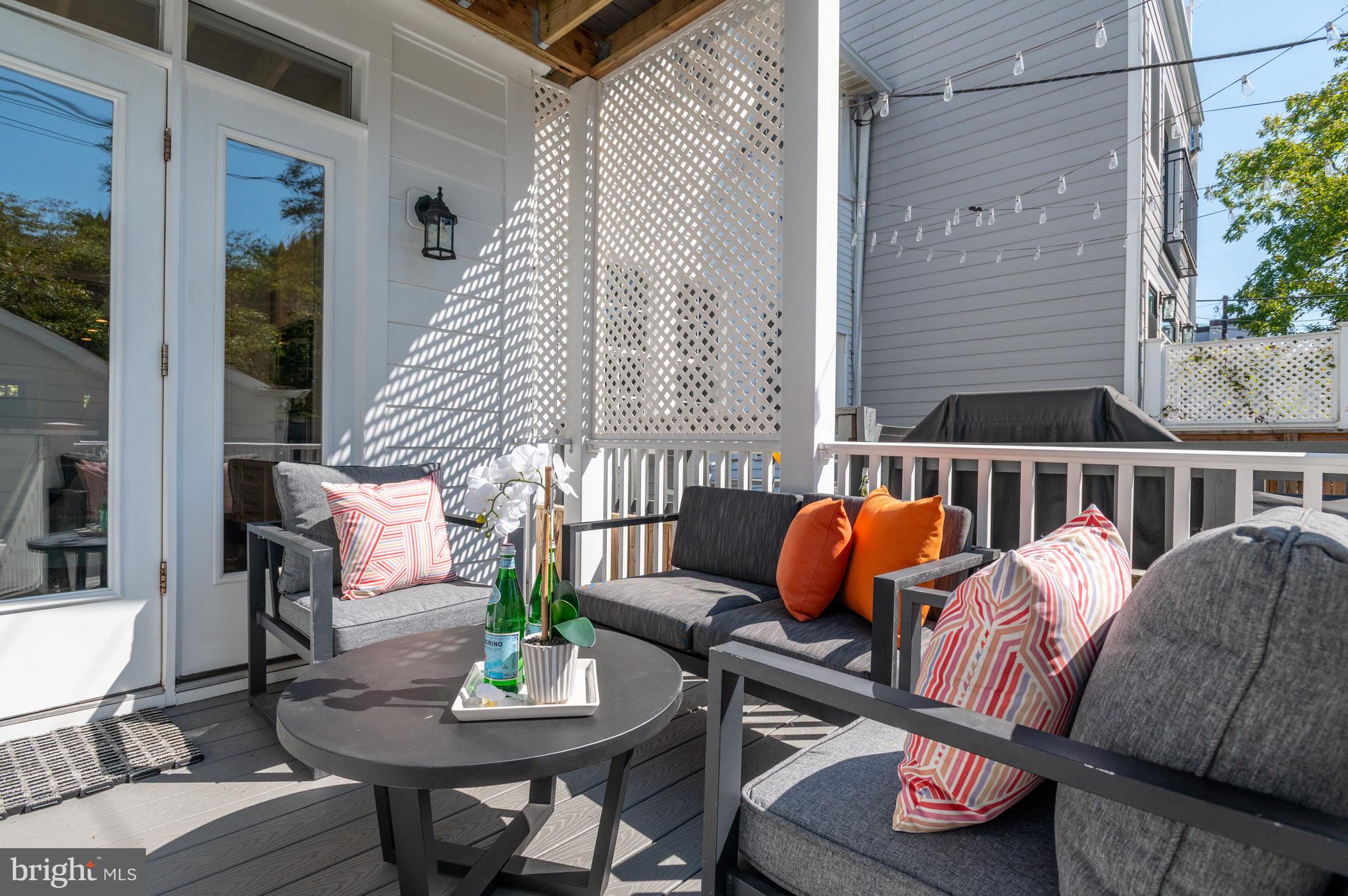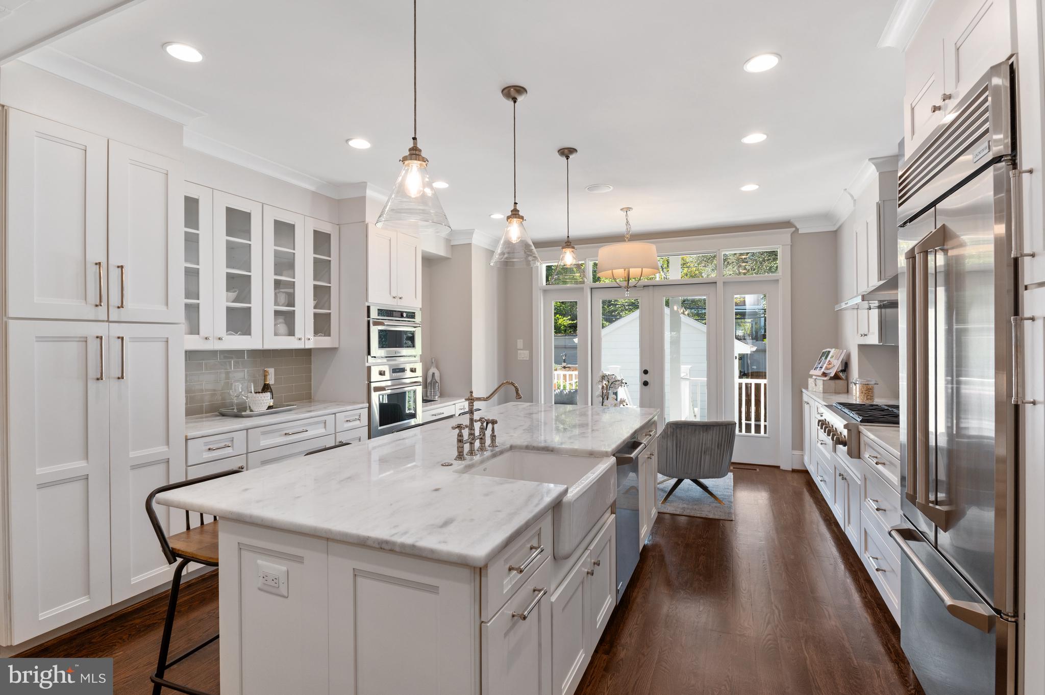 Welcome to this impeccably maintained, upscale Bluewater build, custom-designed for modern living, effortless entertaining, and everyday convenience in the heart of Burleith. The main level boasts an open-concept layout, connecting the kitchen, living, and dining areas. The dining area is centered around an impressive fireplace flanked by custom-built shelves, while the living room showcases elegant, coffered ceilings and recessed lighting. The chef's kitchen is equipped with well-designed cabinetry, high-end appliances, a spacious island, and opens directly to a deck that's perfect for summer grilling. A rear sitting area off the kitchen can be used as a flex space that overlooks the deck. A cubby area and powder room can also be found by the front door for added convenience. Brazilian hard-wood floors are found throughout the home.