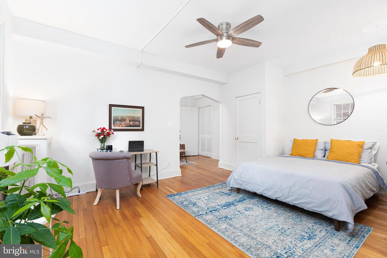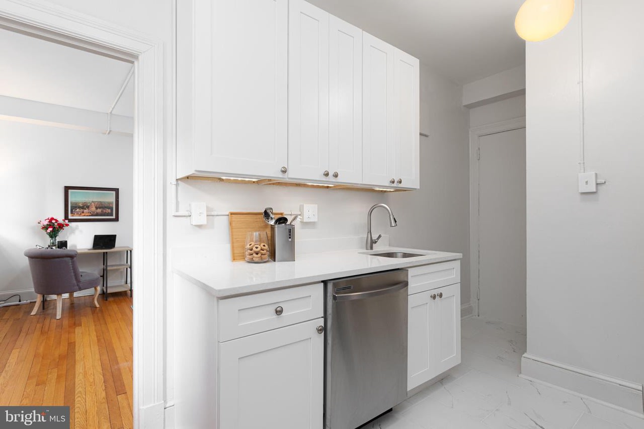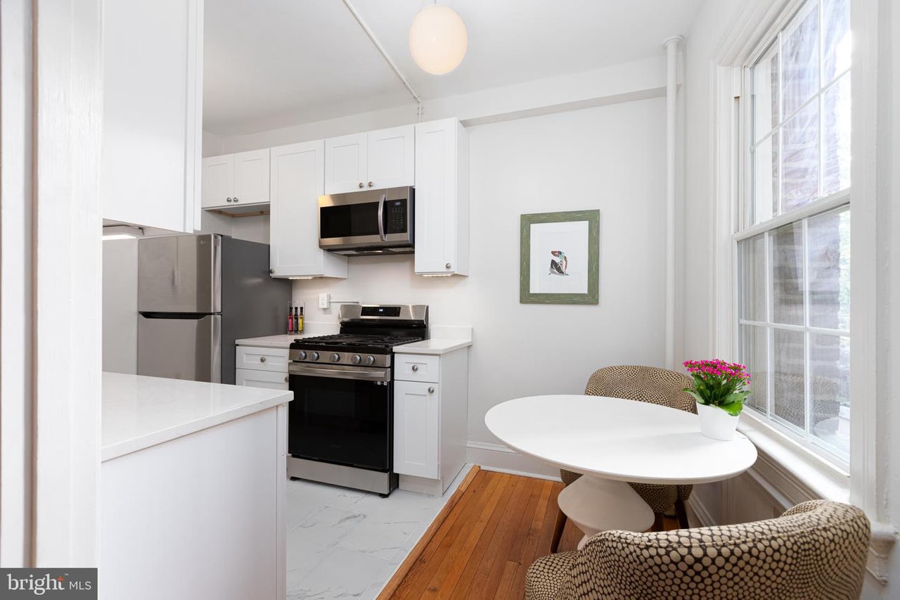 Welcome to The Louie Condominium! This large studio includes a separate living area away from the bedroom area. Step inside to 9’ ceilings, original refinished hardwood floors, original foyer archway, and brand new large eat-in kitchen. There is a walk-in closet in the bedroom area. In the kitchen you will find all new cabinets, stainless steel appliances, quartz countertops, under cabinet lighting, and an area for a small kitchen table and two chairs. The bedroom area is large enough to hold a bed, a couch, and office space to work from home. The unit gets the best afternoon and evening light. In the unit, you will stay cool over the summer with the brand new and quiet Midea window unit that still lets in plentiful natural light. Just ranked the best window unit on the market! In the bathroom step into the shower with the spa-like shower head and you will feel like you are on vacation. New lighting throughout the unit. The Louie condominium is well managed, keeping condo fees low! Condo fee is $254 and even includes heat. Condo fees have only seen a nominal increase twice in ten years. Throughout the building you will see the charm of a well-maintained almost 100-year-old building with all the modern conveniences. In the basement you will find laundry, an exercise room, a bike room, and a storage locker. Because The Louie is on a corner lot we have a nice side yard which is great to relax with a glass of wine on warm summer nights. Just outside the condo is the bus stop for the L1/L2 which takes you downtown to Farragut Square or Foggy Bottom. Step outside the condo and head up to the business district of the neighborhood where there are plenty of restaurants and shops to choose from. Also, in walking distance down Connecticut Ave you will find more restaurant options like Little Red Fox (get the breakfast burrito!), I’m Eddie Cano (one of the best Italian restaurants in the city), and now Italian Bar. Don’t forget Politics and Prose or Comet Ping Pong. If you need the metro, Friendship Heights is less than a mile away. You may have heard of the changes coming to this Chevy Chase neighborhood business district. Check out the Urban Turf article.